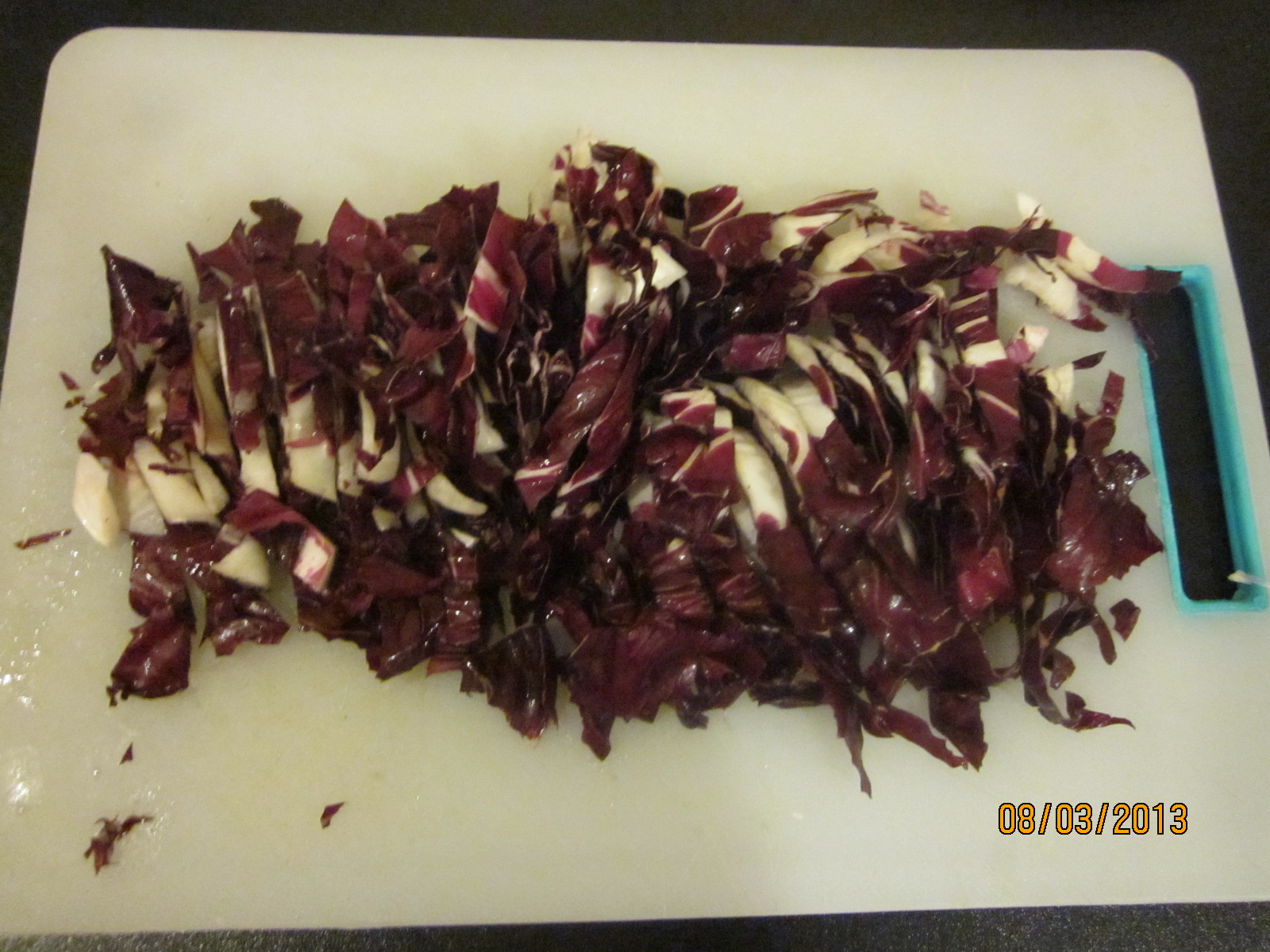 Ho pulito e tritato la cipolla e l'ho messa a soffriggere nella padella.Ho lavato le foglie di radicchio, le ho asciugate con la centrifuga e le ho tagliate a listarelle sottili.